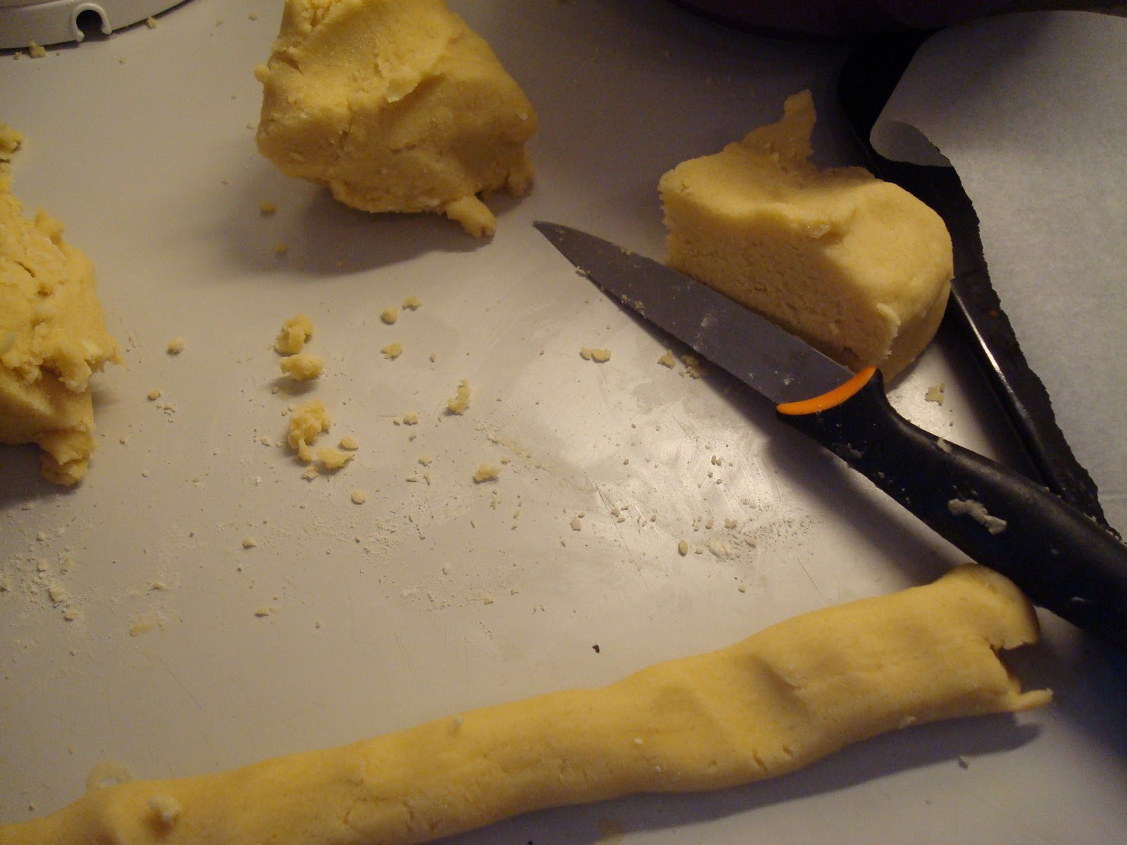 - Del dejen i 4 dele og rul dem ud i lange pølser. Skær hver pølse i 12 stykker.