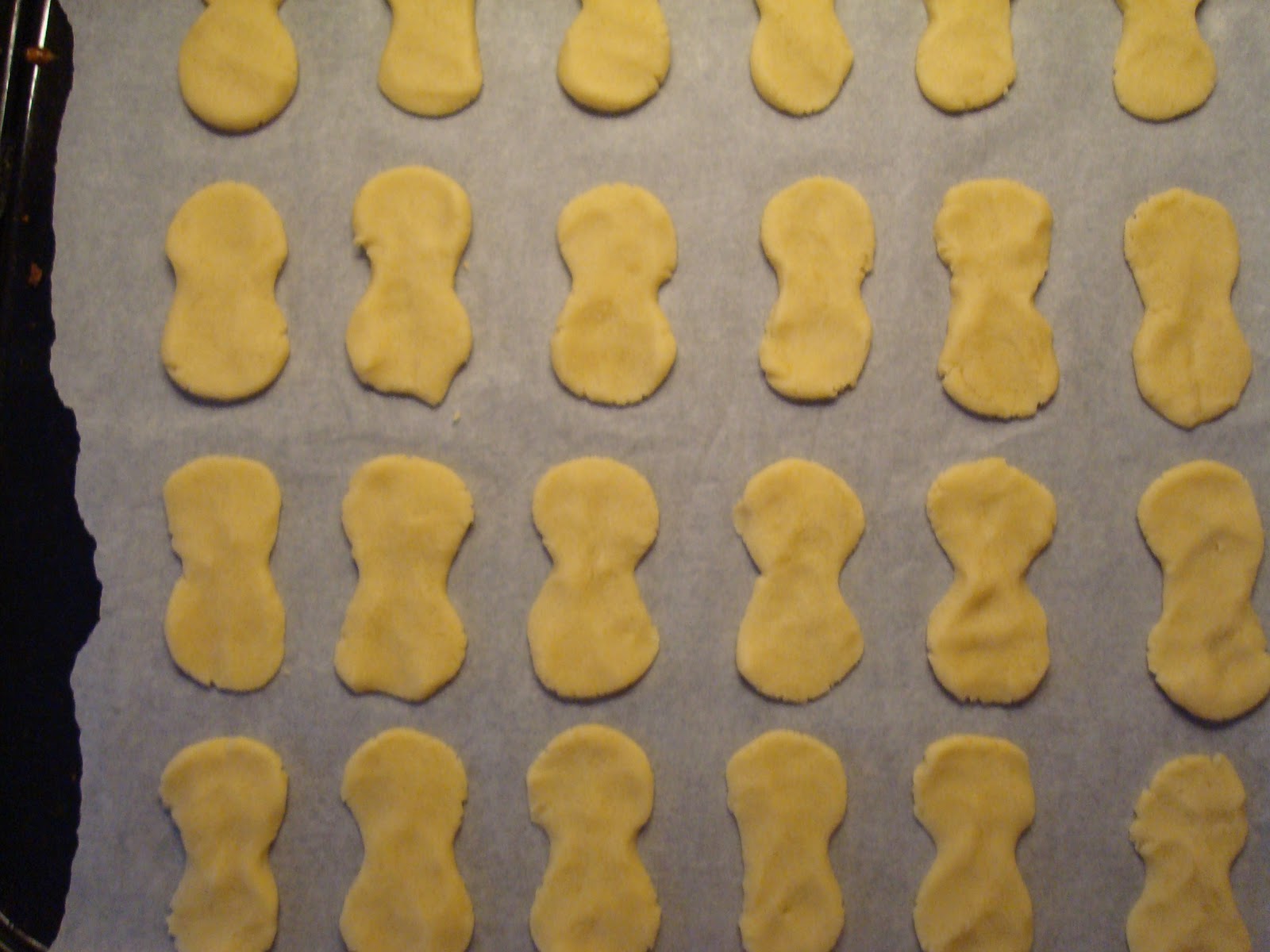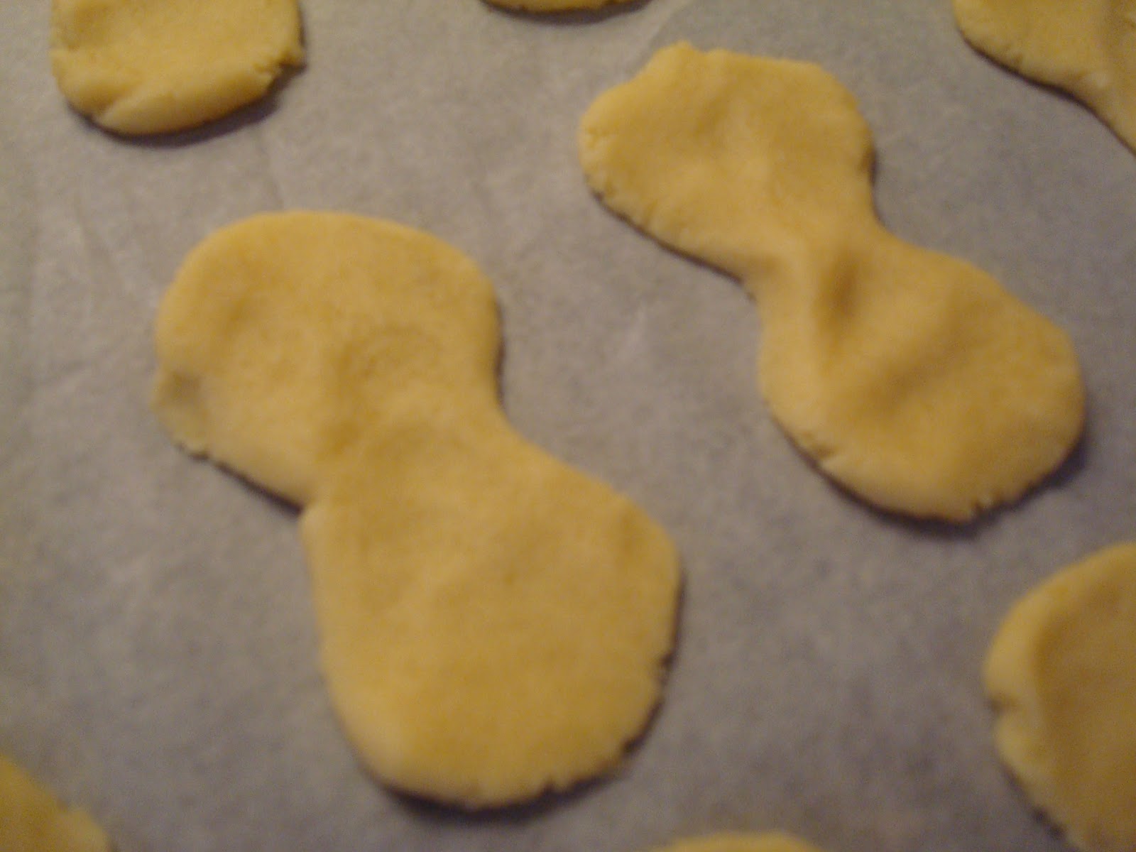 - Rul stykkerne til kugler, med tommel og pegefinger trykke kuglen sammen på midten, så den ligner lidt en snemand. Læg den på en bageplade med bagepapir og tryk den formede kugle flad.