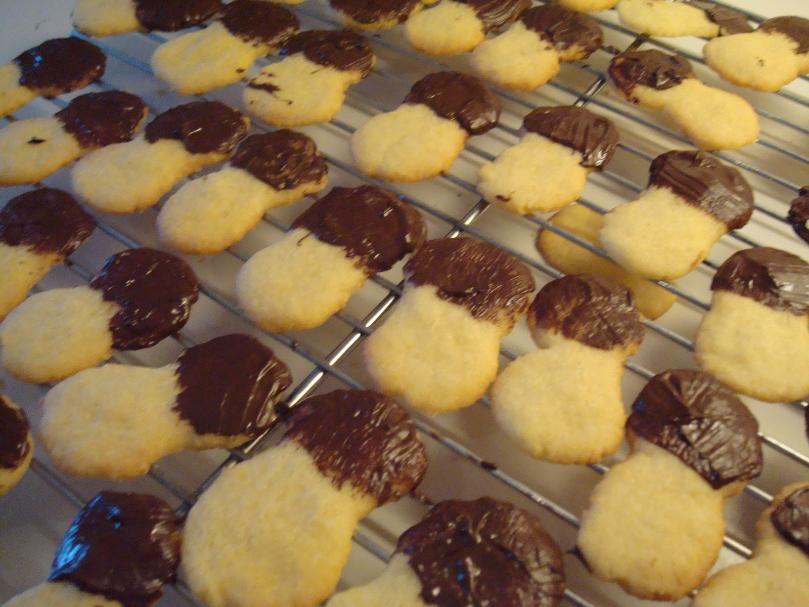 - Når kagerne er kolde, smeltes mørk chokolade og den ene ende pensles med mørk chokolade.