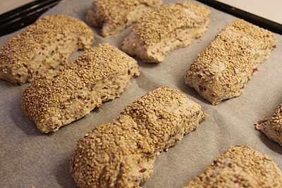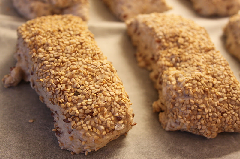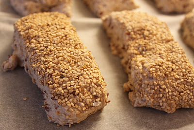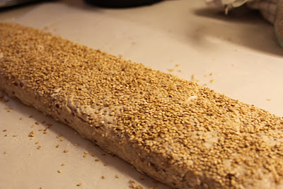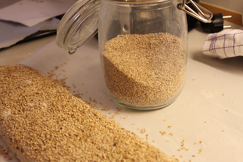 - Form dejen til en aflang pølse og tryk den firkantet. Pensl med vand og rul rullen i sesamfrøene.