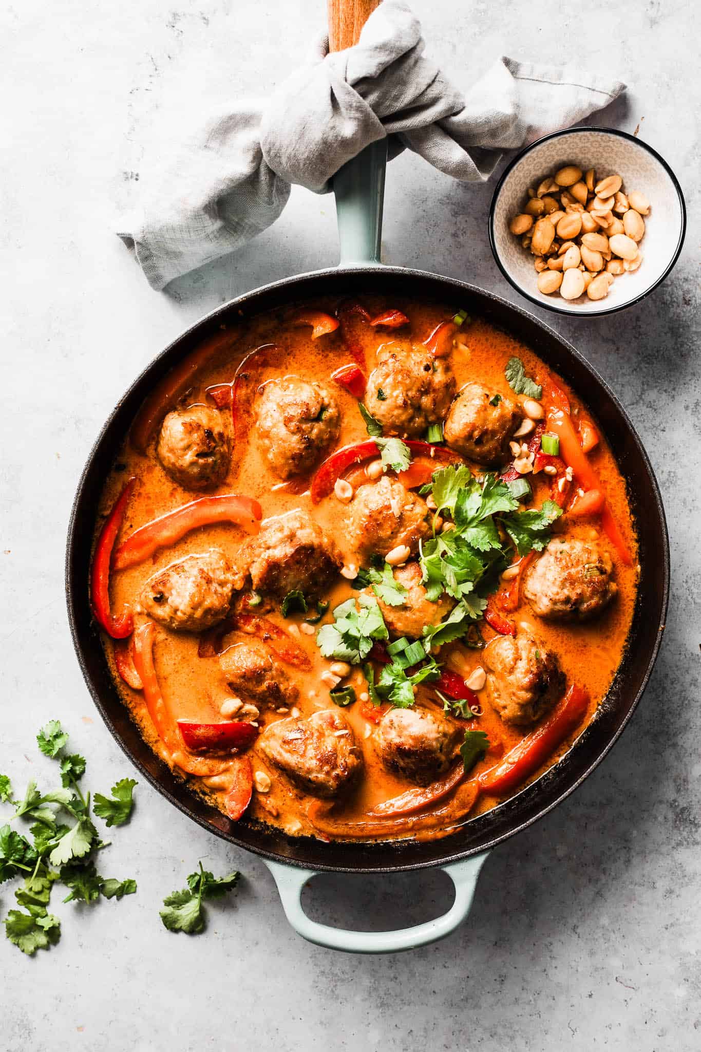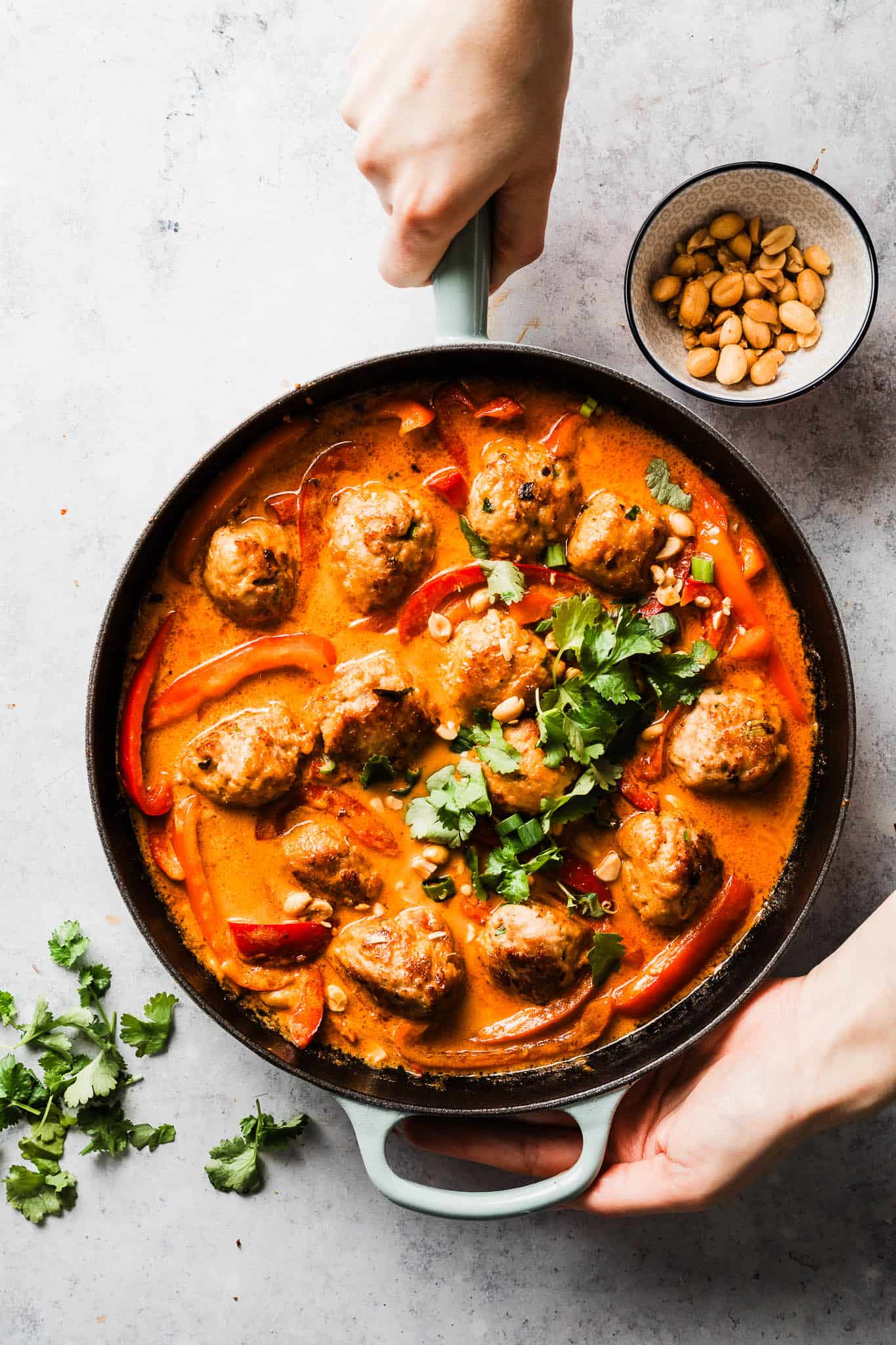 Nemme og hurtige kødboller i krydret sauce med rød karry, kokosmælk og peberfrugt. Lige med et drys peanuts og en skålfuld ris eller nudler, så er der nem aftensmad med masser af smag. Find opskriften på thai kødboller her.