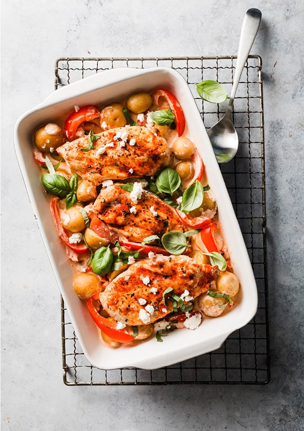 - Bag i ca. 20-25 minutter (afhænger af tykkelse på kyllingbrysterne), til kyllingebrysterne er tilberedte og kartoflerne møre. Har du meget tykke kyllingbryster kan du dække fadet til med alufolie.